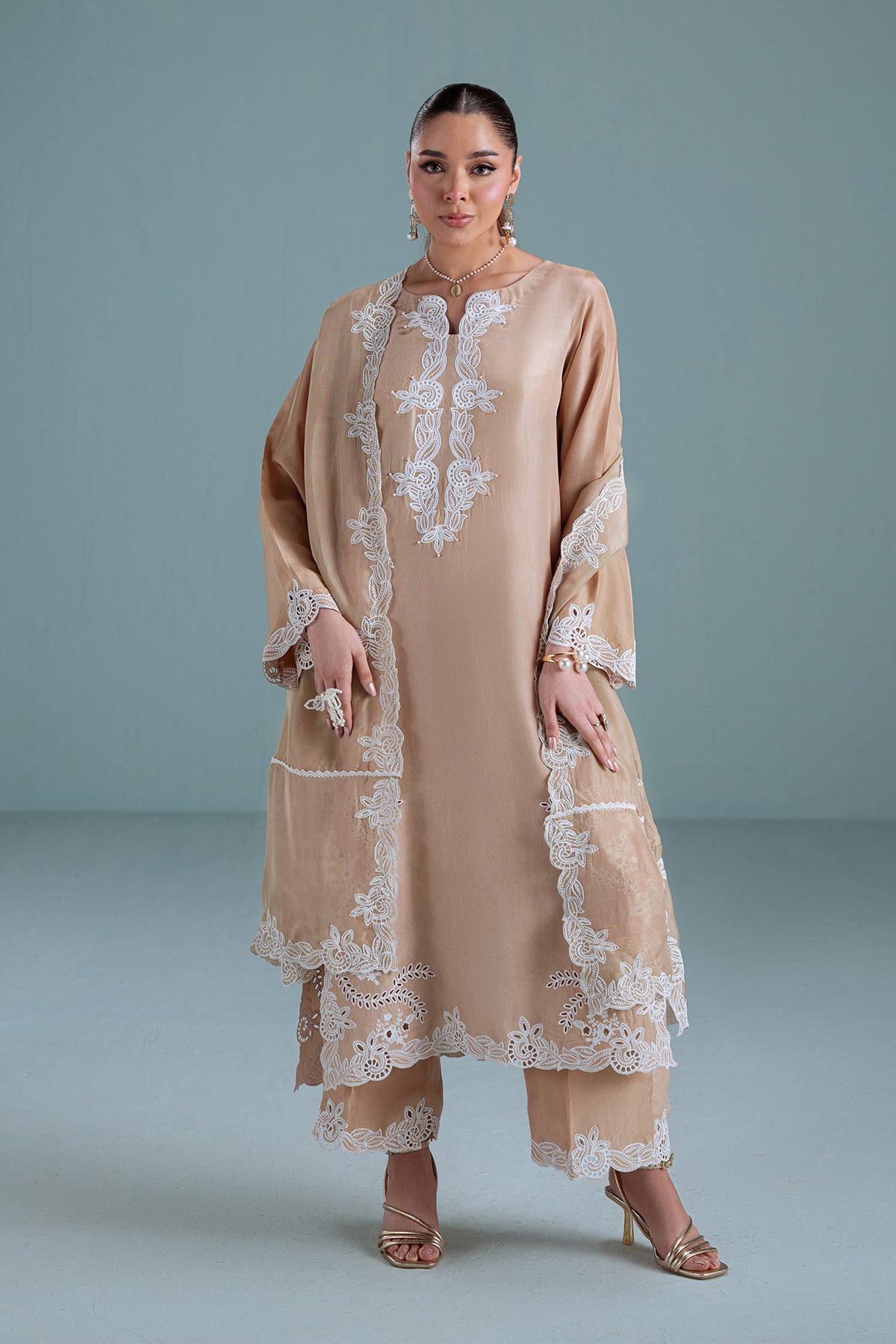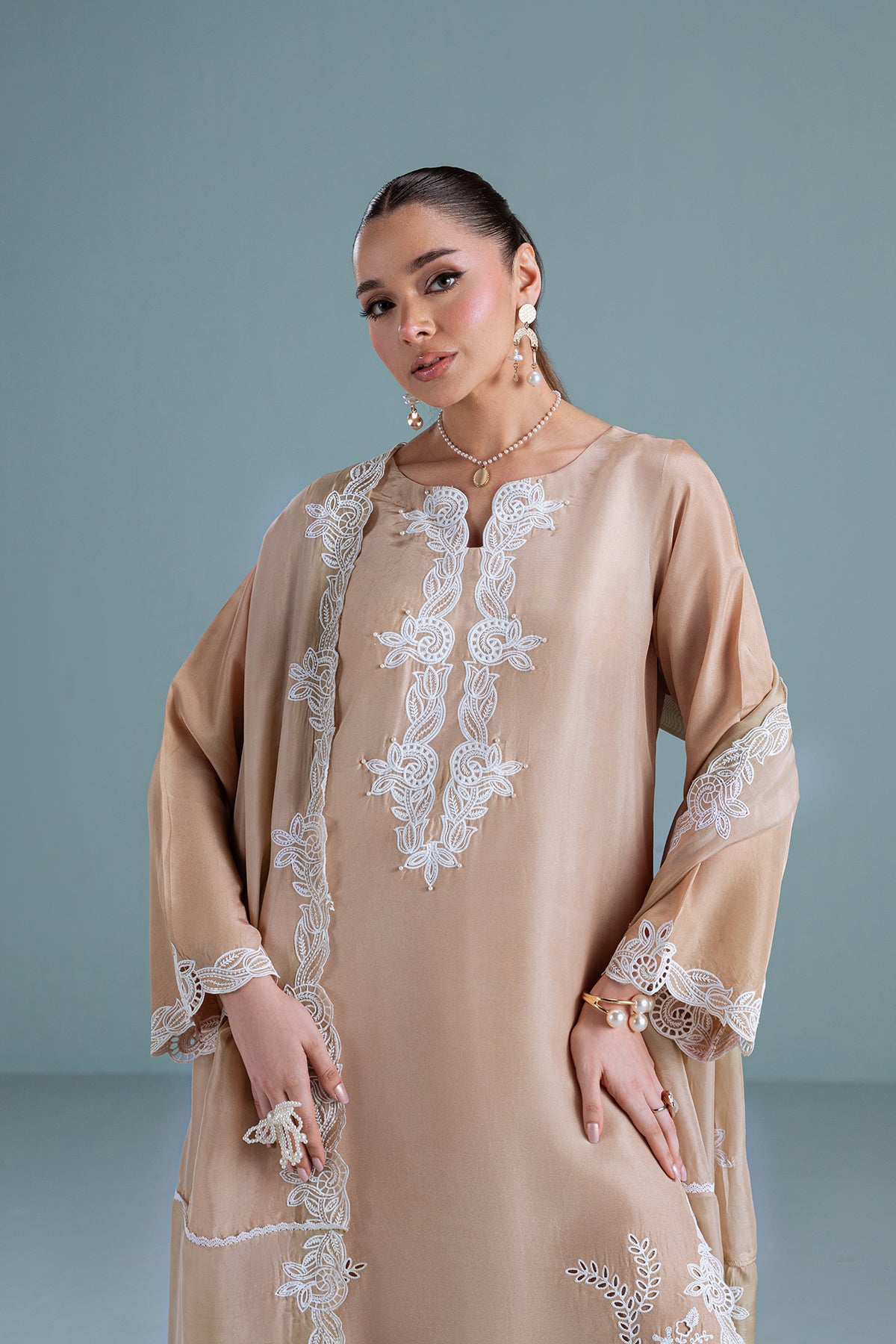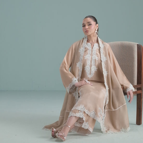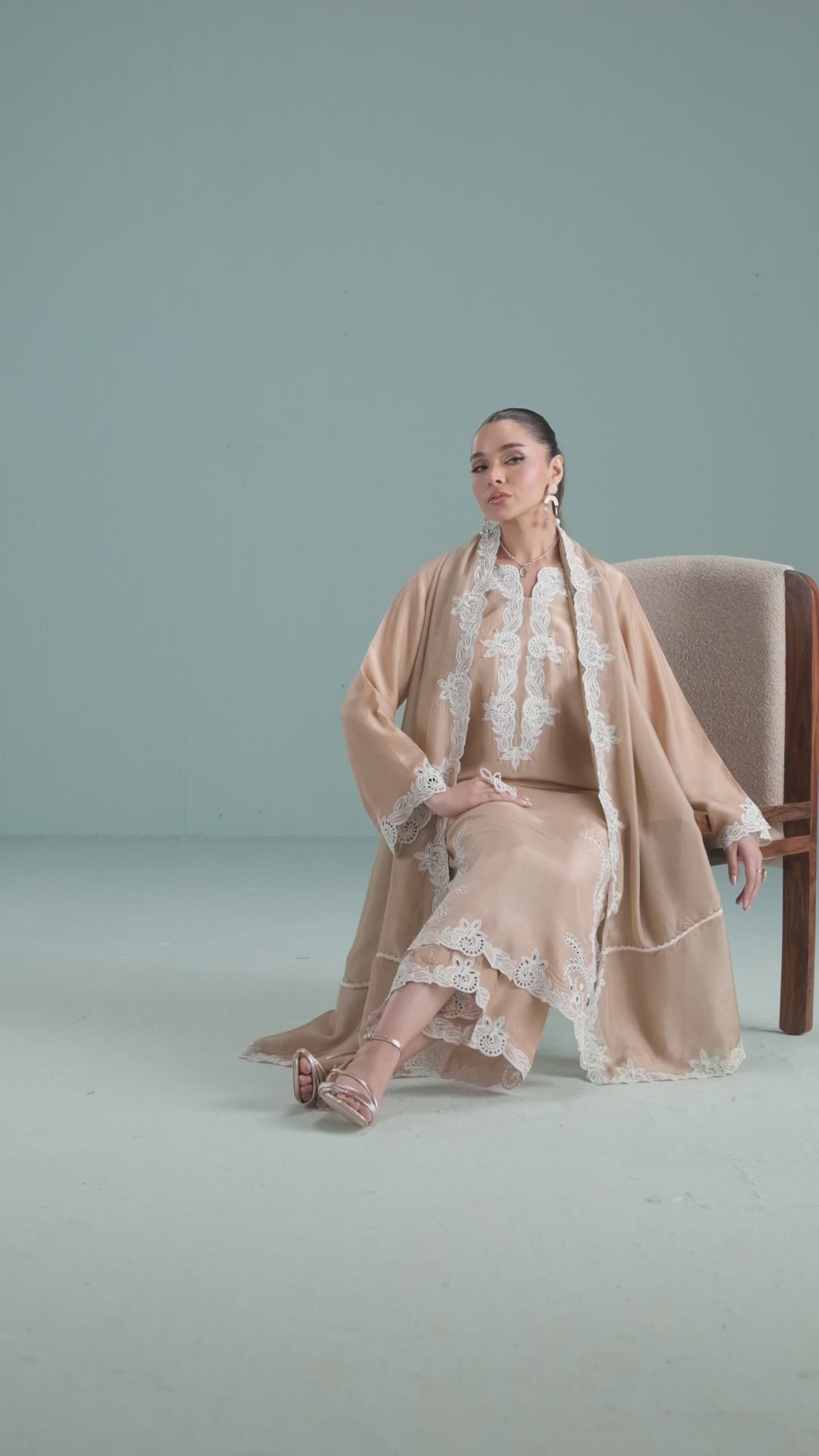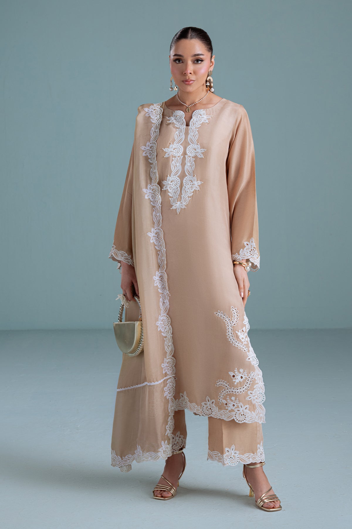 Freya is a 3-piece pale gold sheesha silk ensemble, adorned with delicate white floral embroidery, subtle boring and accented with pearls along the neckline for a touch of refined elegance. Paired with loose pants and a matching medium silk dupatta.