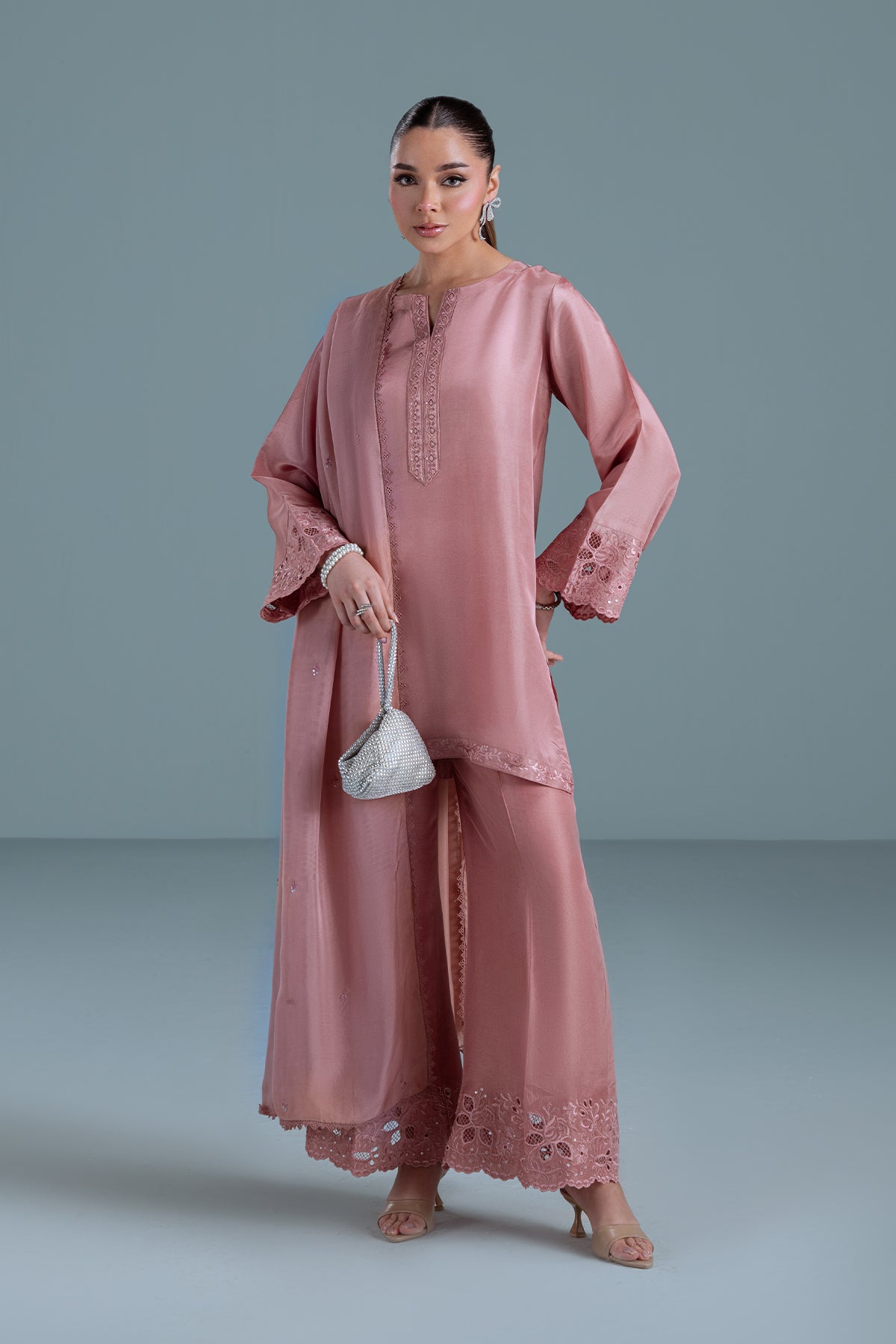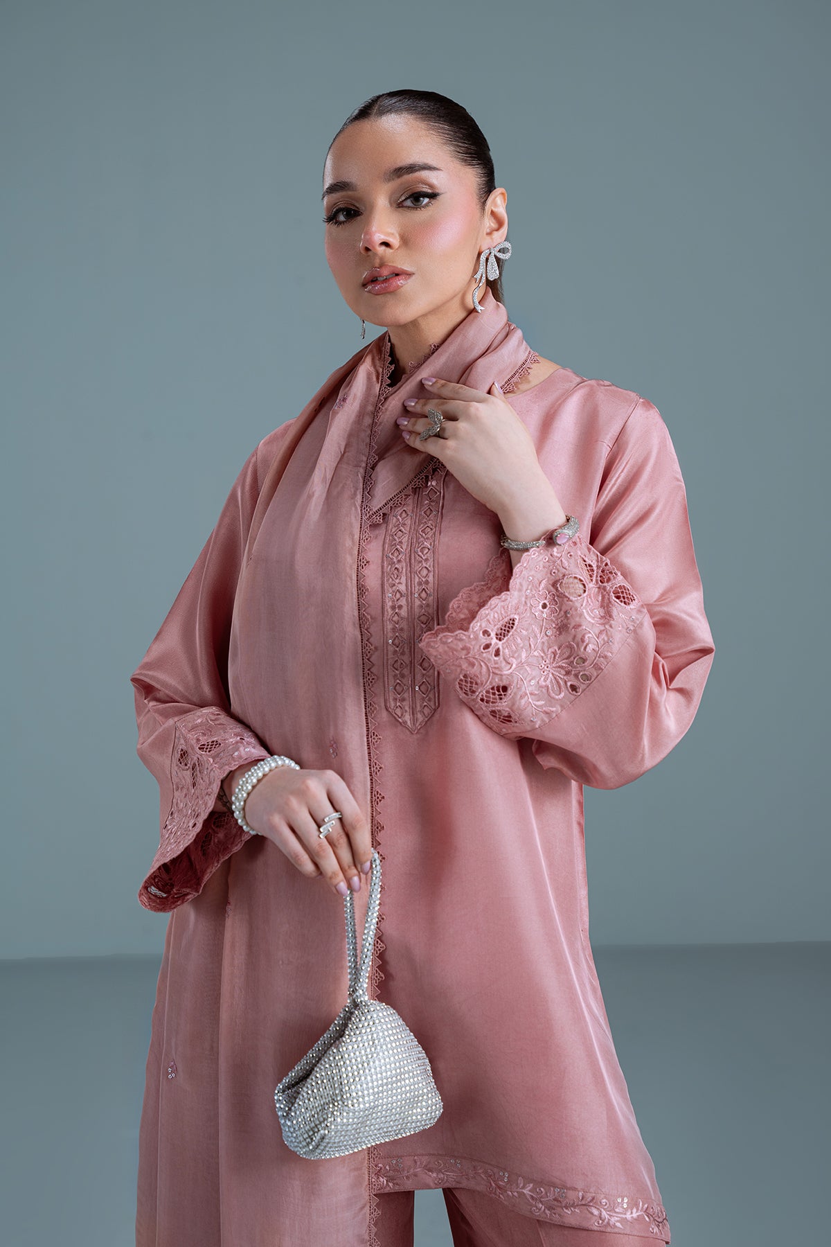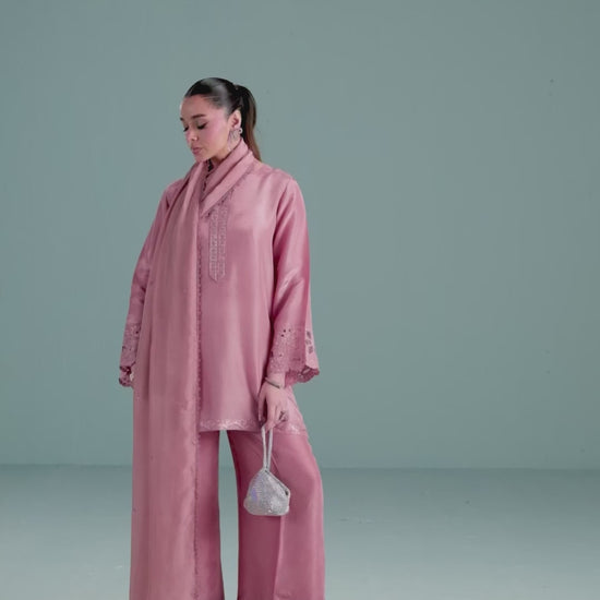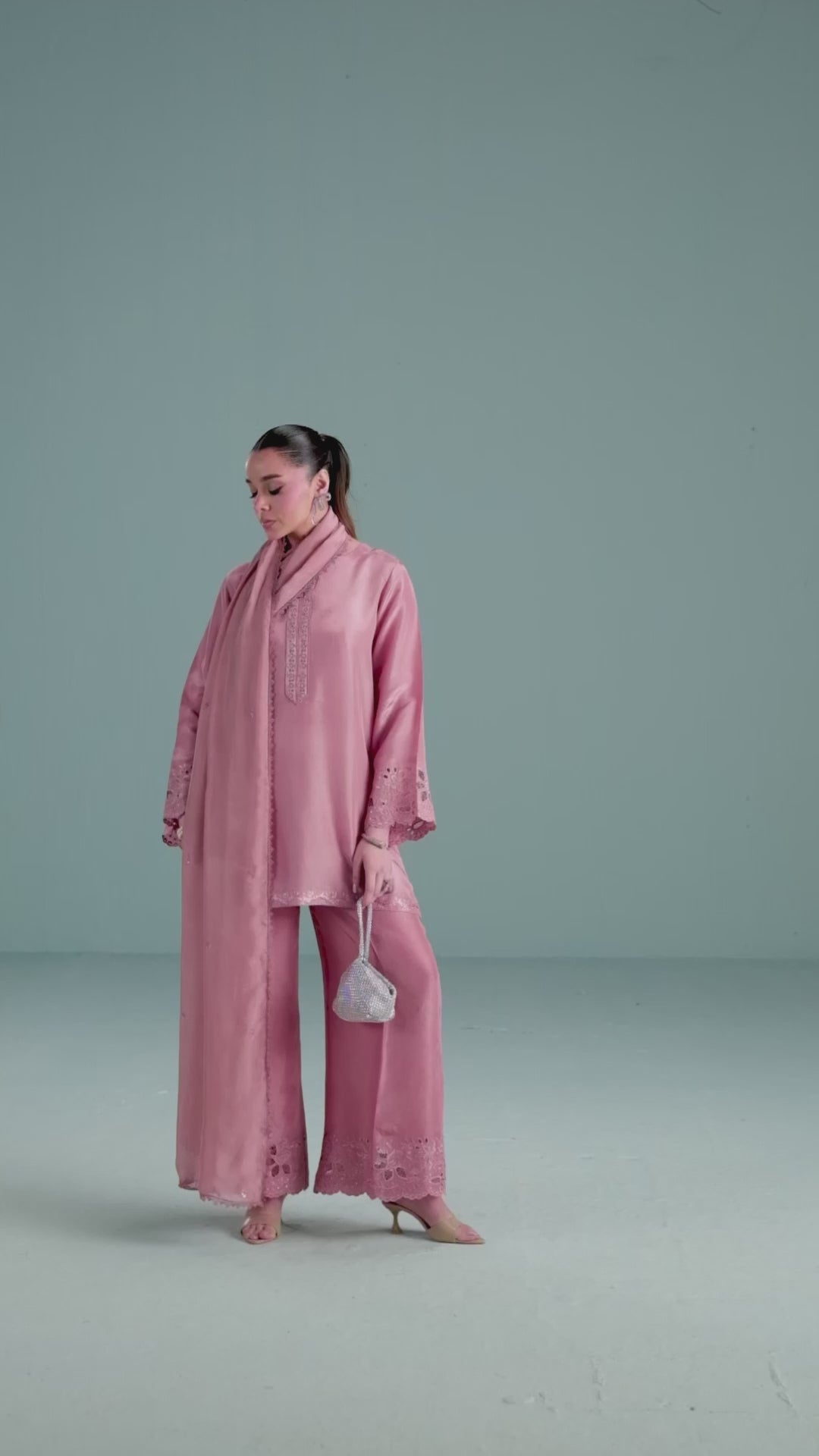 HANA-B is a 3-piece dusty pink sheesha silk ensemble with subtle colour-on-colour floral embroidery, intricate boring and jaali work, and delicate sequins on the short shirt. Featuring loose azaar pants with matching embroidered details. Paired with a medium silk dupatta adorned with motifs and a gentle sequin spray.
