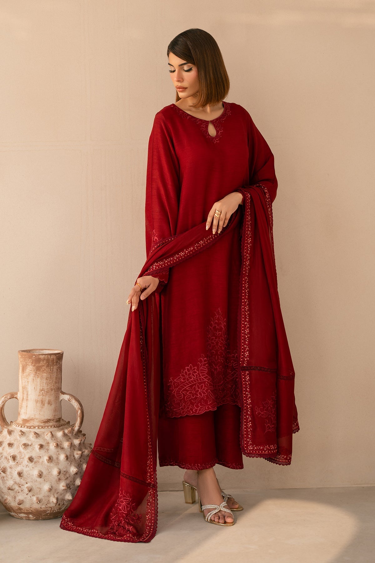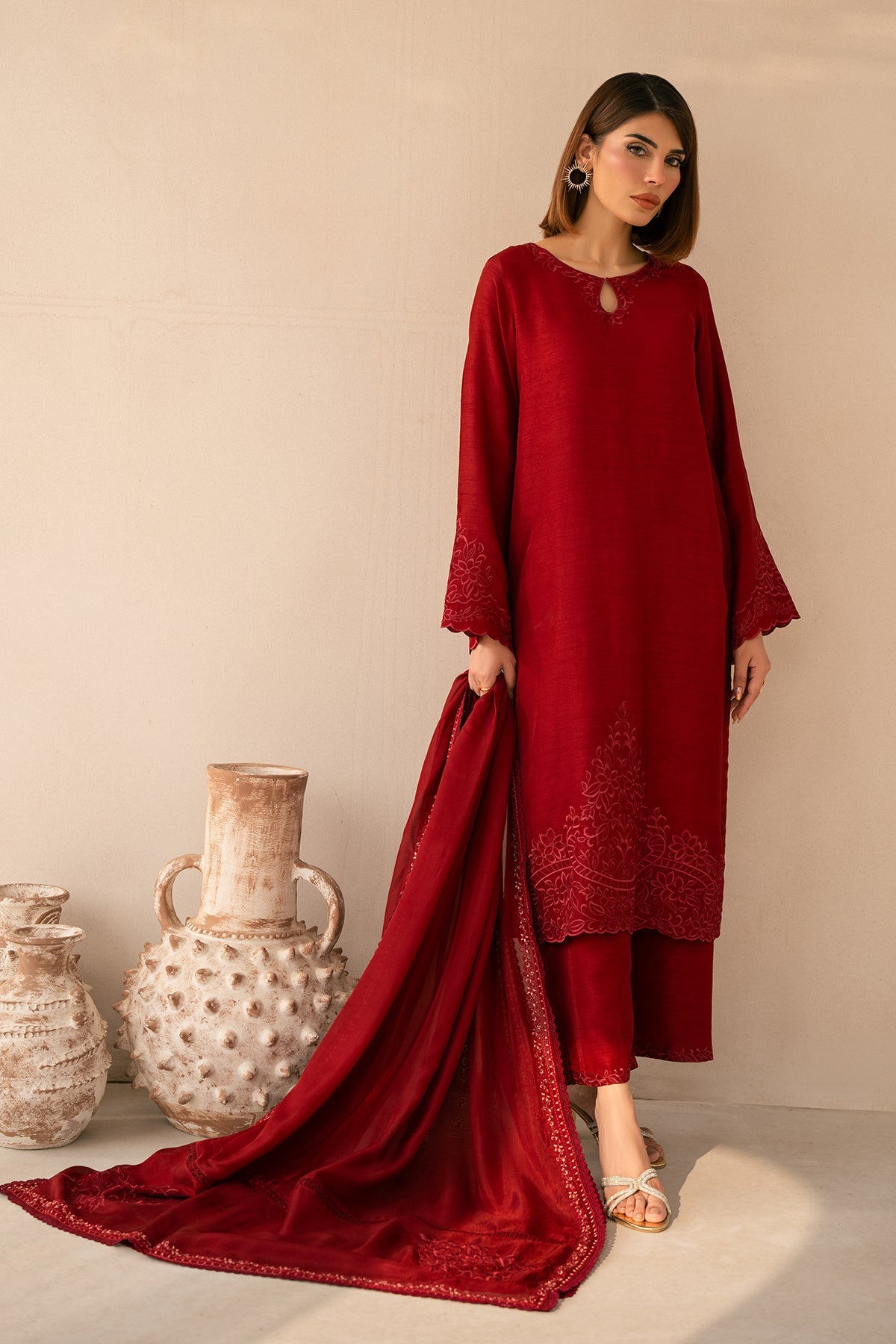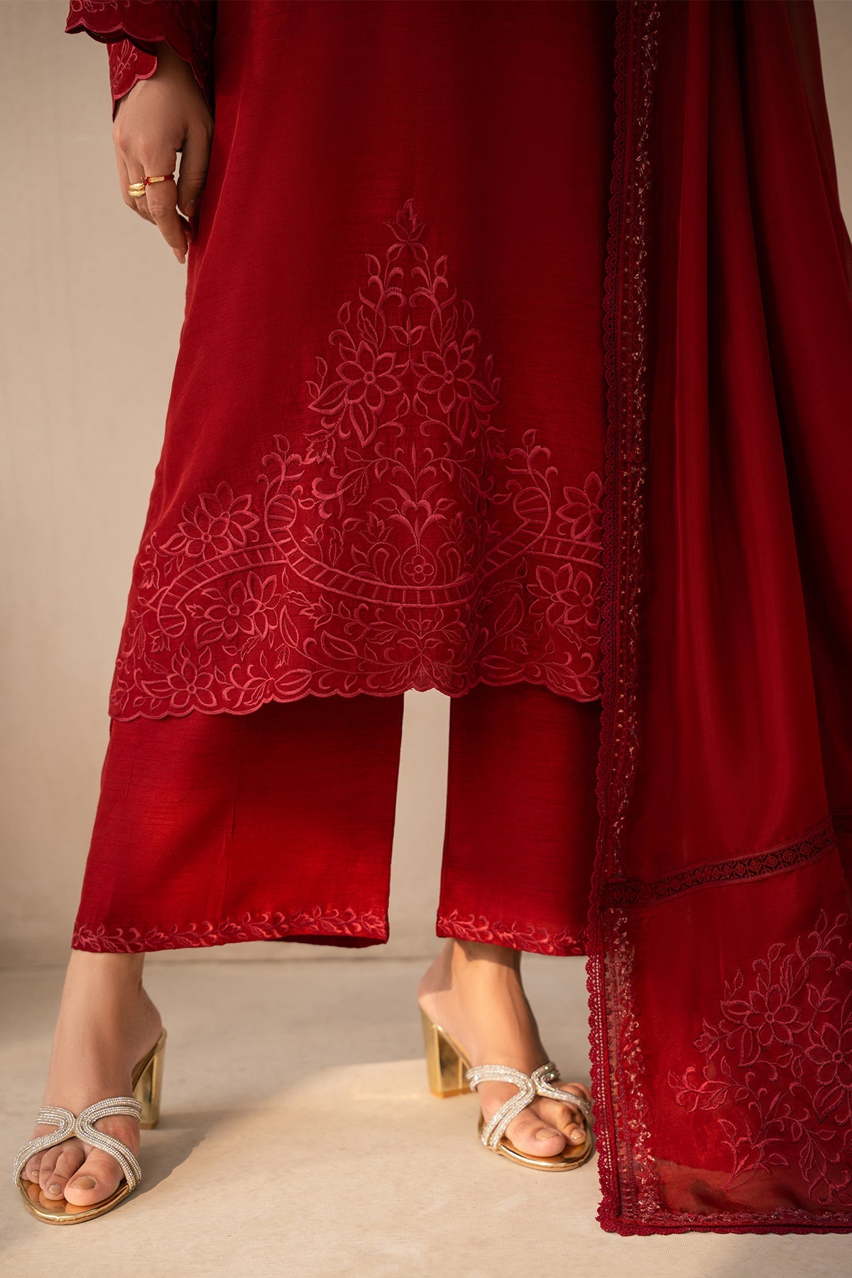 STELLA is a maroon raw silk 3pc ensemble with monochromatic floral threadwork on the sleeves, ghera and neckline. Paired with flared pants, and a colourful embroidered silk dupatta featuring statement motifs on the pallu.