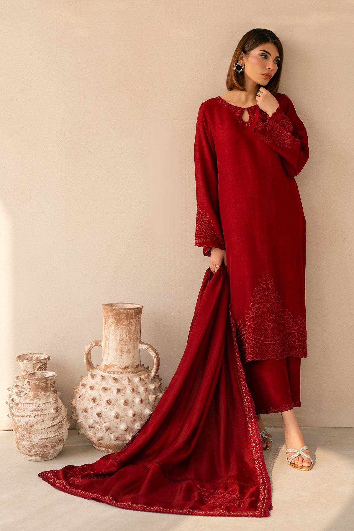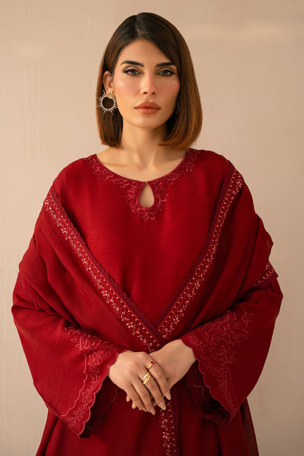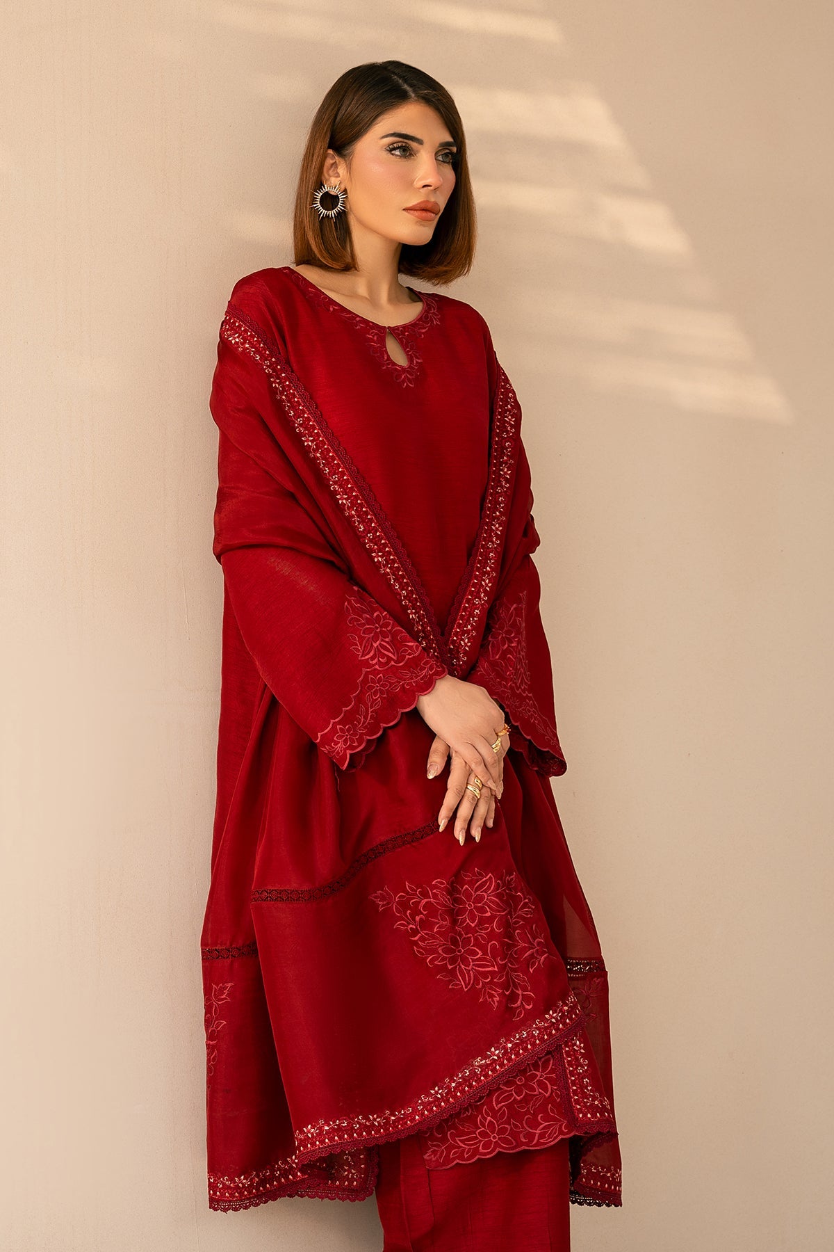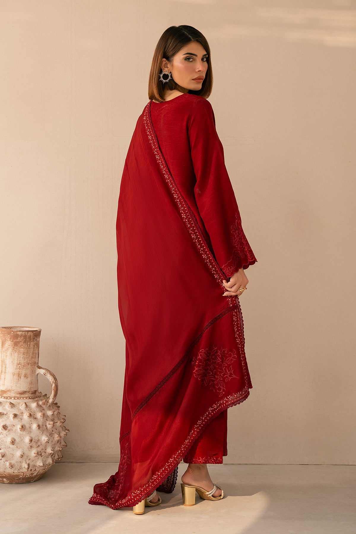 STELLA is a maroon raw silk 3pc ensemble with monochromatic floral threadwork on the sleeves, ghera and neckline. Paired with flared pants, and a colourful embroidered silk dupatta featuring statement motifs on the pallu.