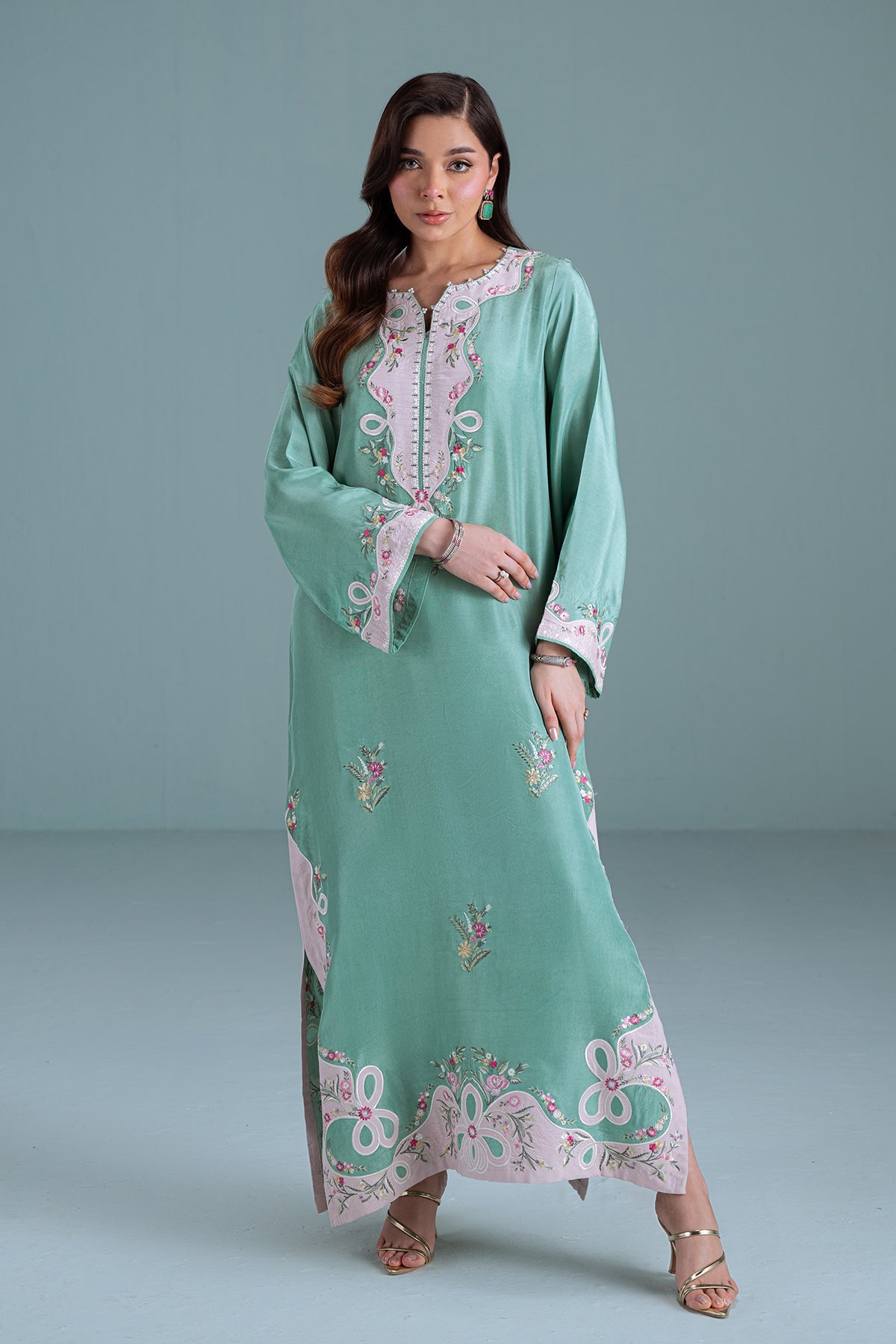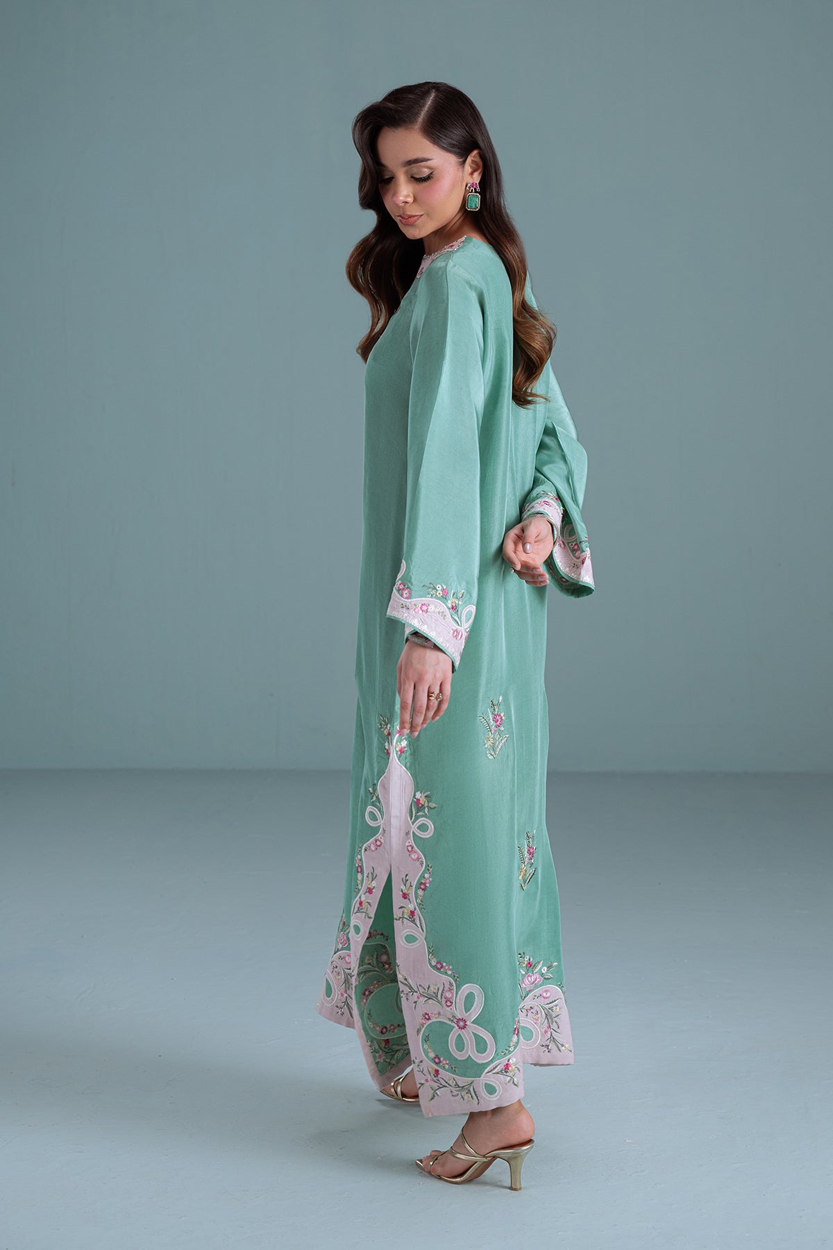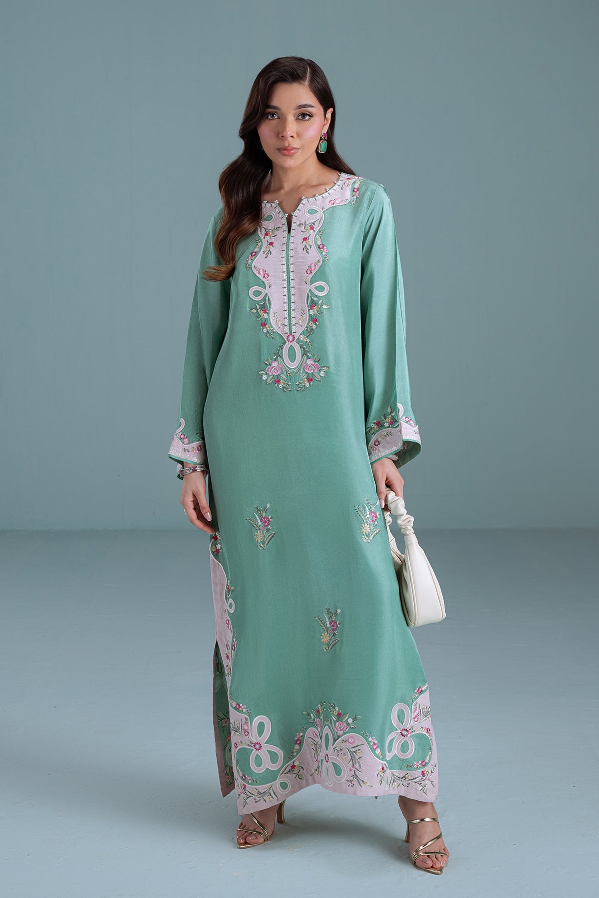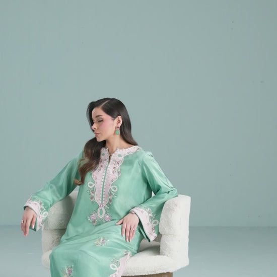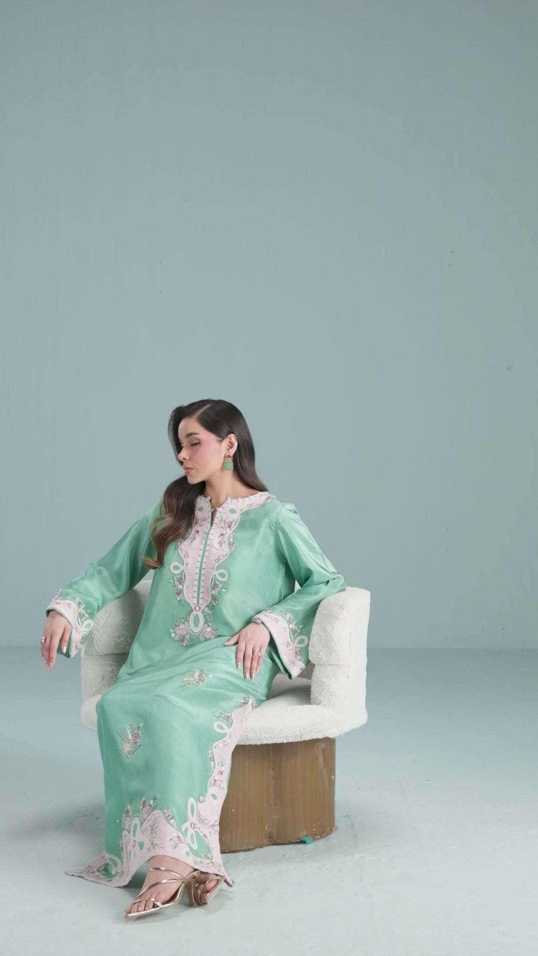 TIYA is a 1-piece aqua kaftan crafted on sheesha silk, adorned with delicate floral embroidery in soft pastel hues. Featuring a baby pink appliqué neckline, sleeves, and hem detailed with intricate embroidery. Scattered motifs across the front and back add a whimsical touch. You can pair it with a straight fit trouser.
