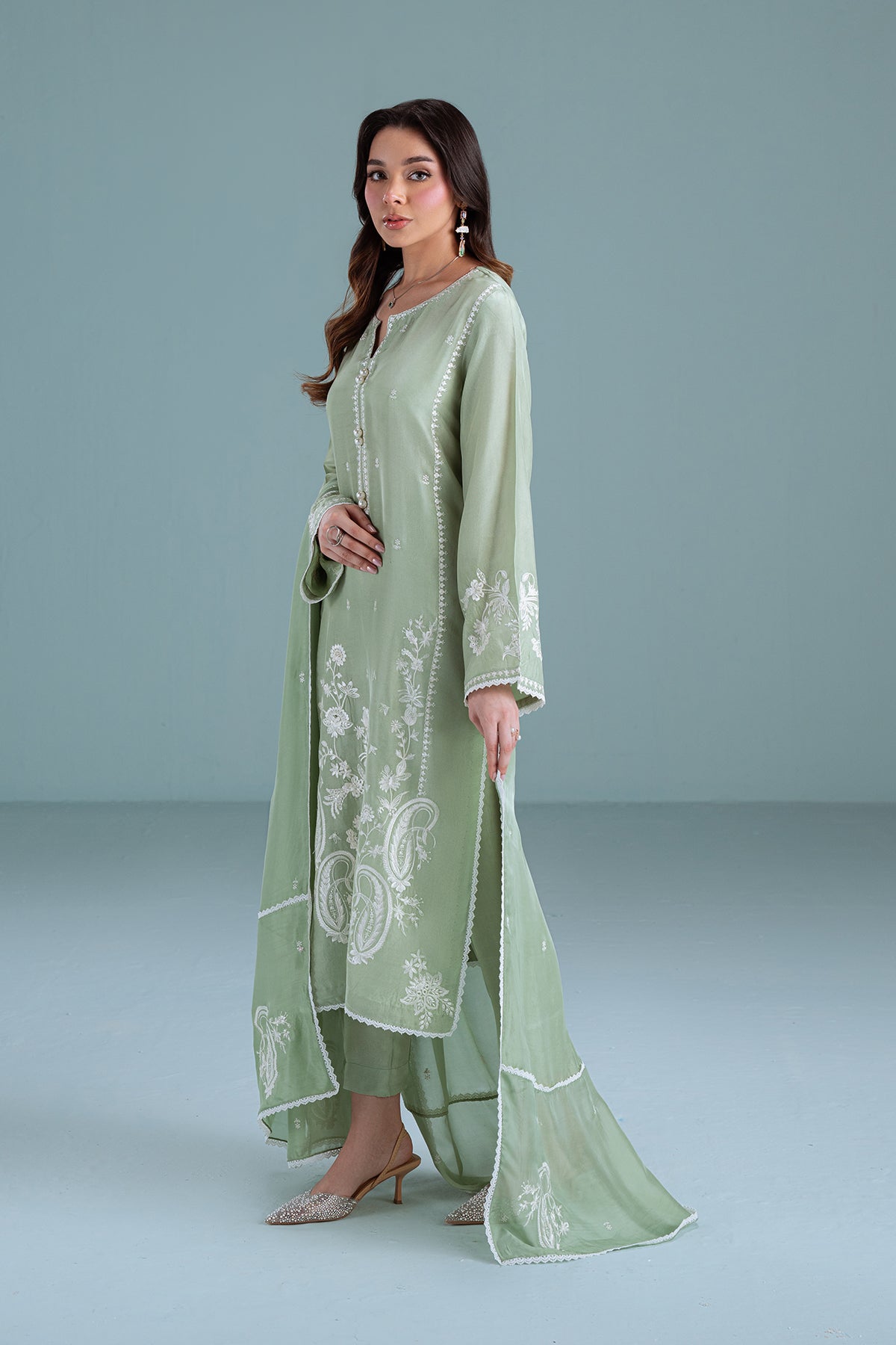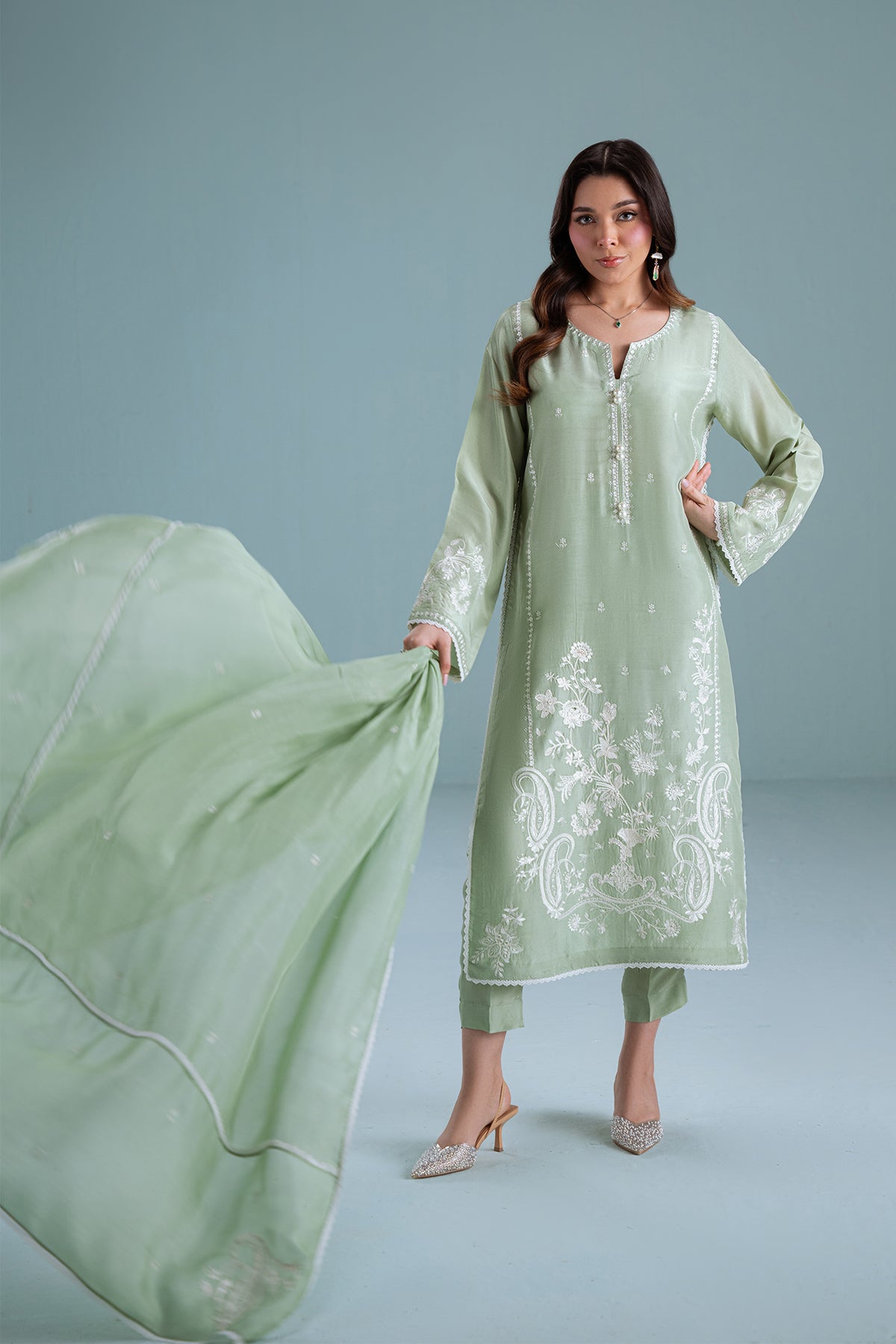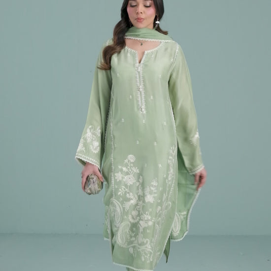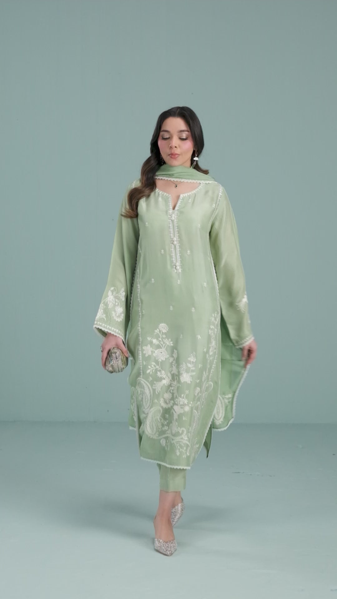 Zaira is a 3-piece pastel green sheesha silk ensemble with delicate ivory floral embroidery and pearl detailing on the neckline. Paired with straight-fit trousers, and a medium silk dupatta adorned with a motif spray and paisleys along the corners for a cooling and elegant finish.