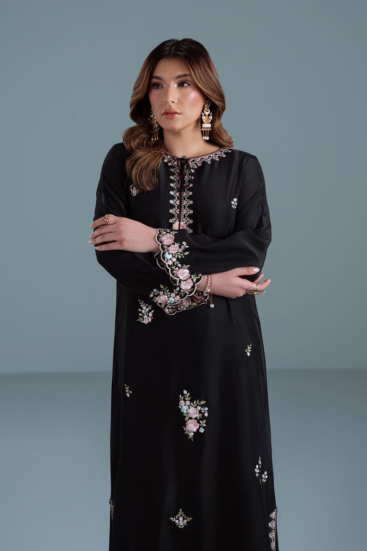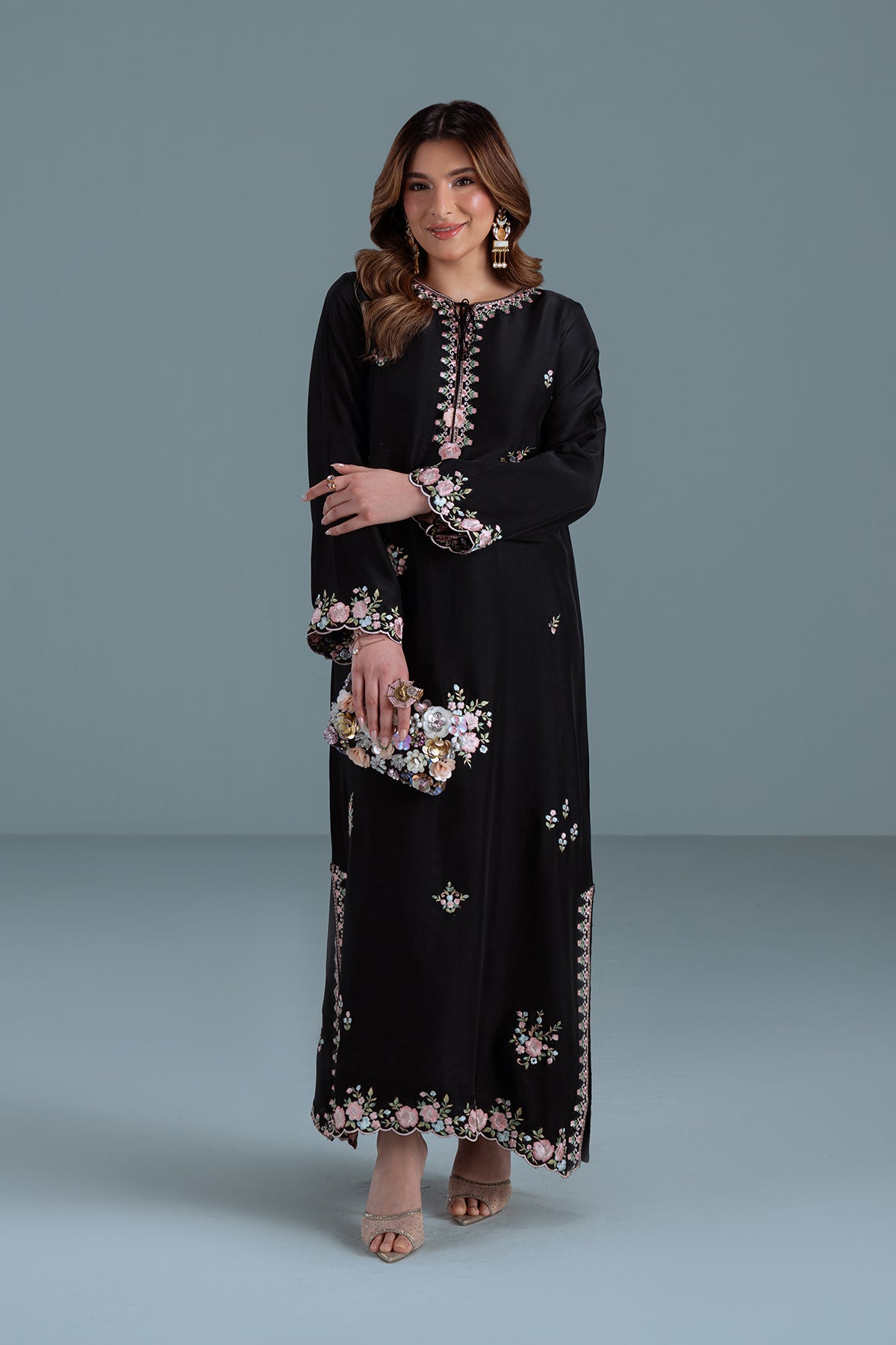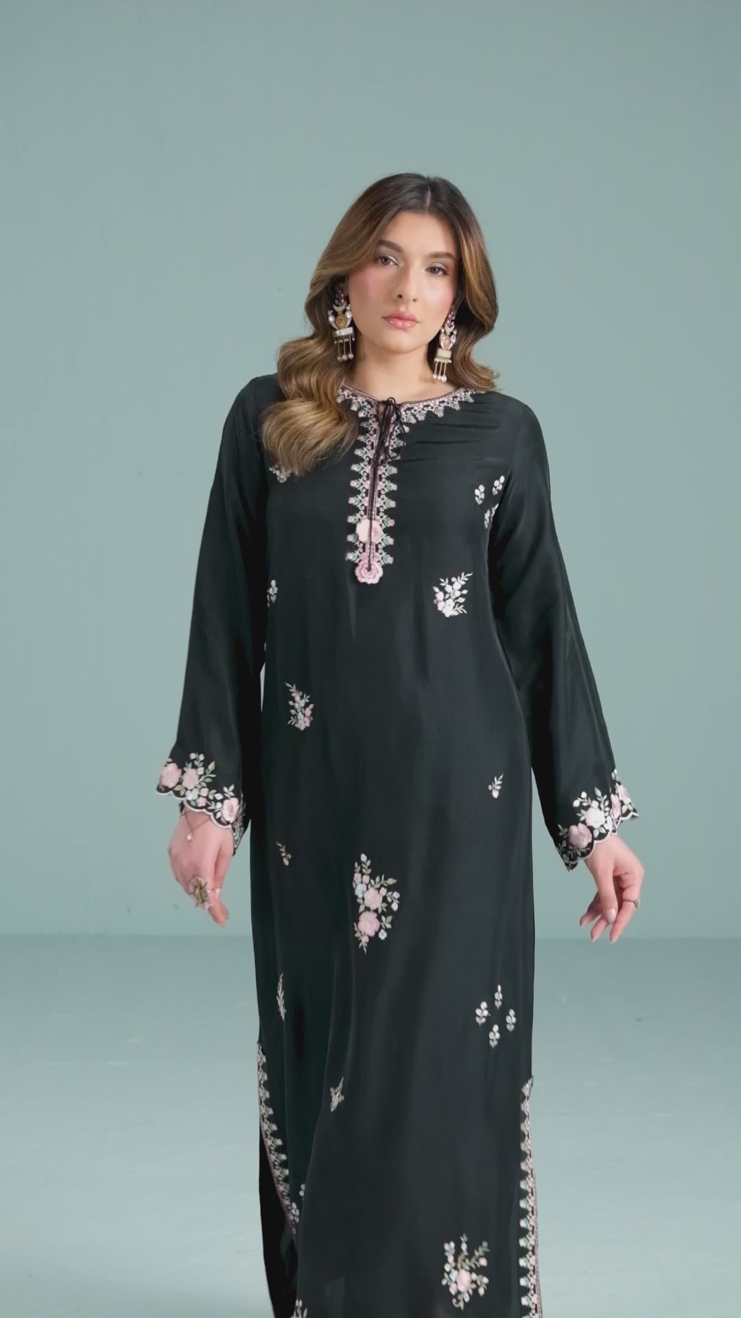 ELLIE-B is a 1-piece black Kaftan crafted on sheesha silk, adorned with intricate floral embroidery in soft pastel shades. Featuring scalloped sleeves and edges and a neckline with embroidered tassels. You can pair it with sleek straight pants as shown above.