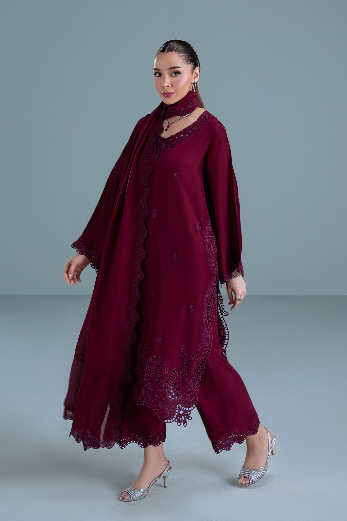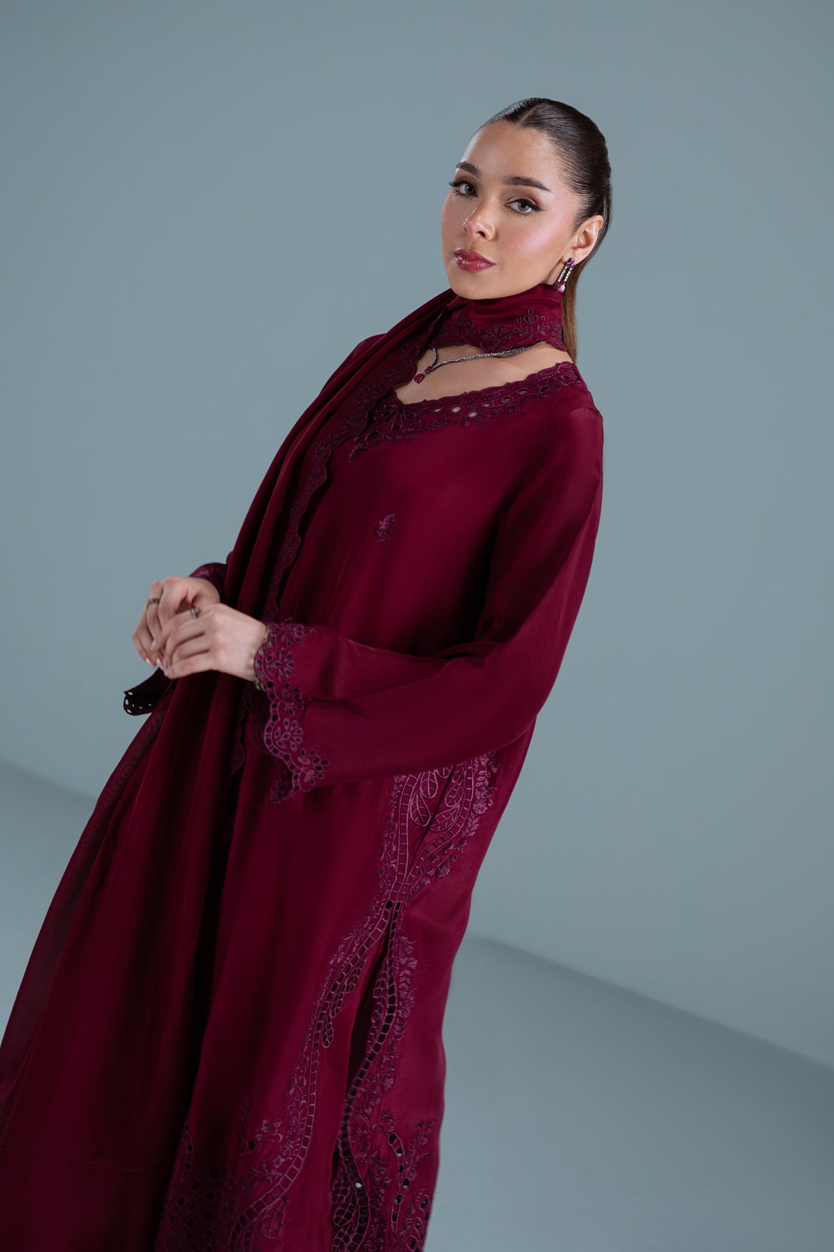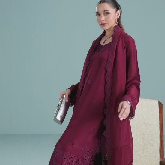 TANYA is a 3-piece deep burgundy sheesha silk outfit with colour-on-colour floral embroidery and intricate boring. Featuring 3D boring along the hem and sides & paired with matching loose embroidered trousers. Completed with a medium silk dupatta, scalloped and framed with floral embroidery on all four sides.