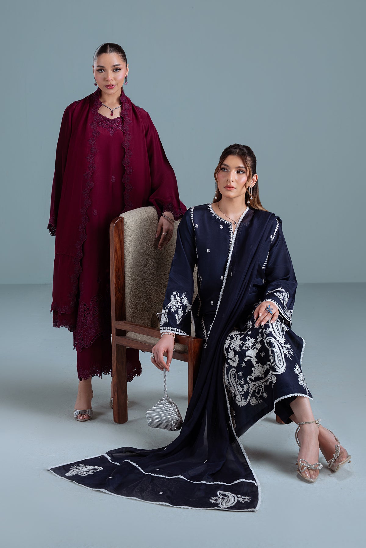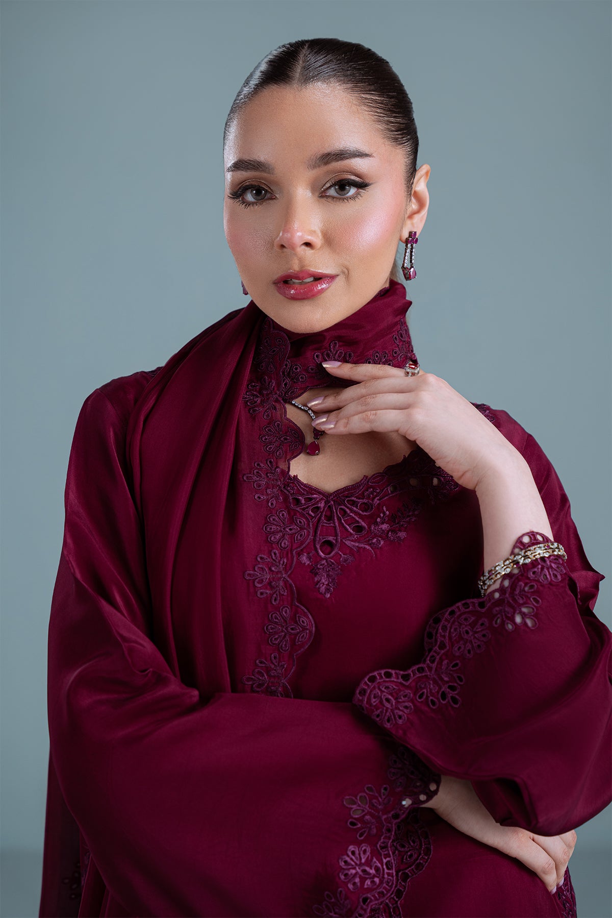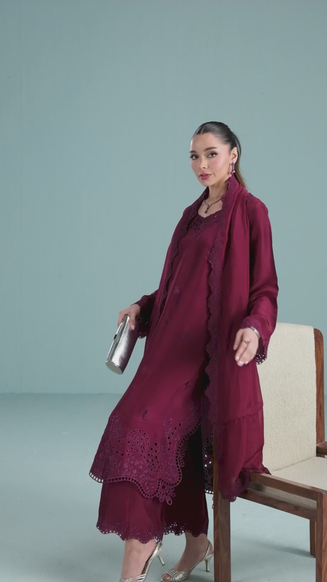 TANYA is a 3-piece deep burgundy sheesha silk outfit with colour-on-colour floral embroidery and intricate boring. Featuring 3D boring along the hem and sides & paired with matching loose embroidered trousers. Completed with a medium silk dupatta, scalloped and framed with floral embroidery on all four sides.