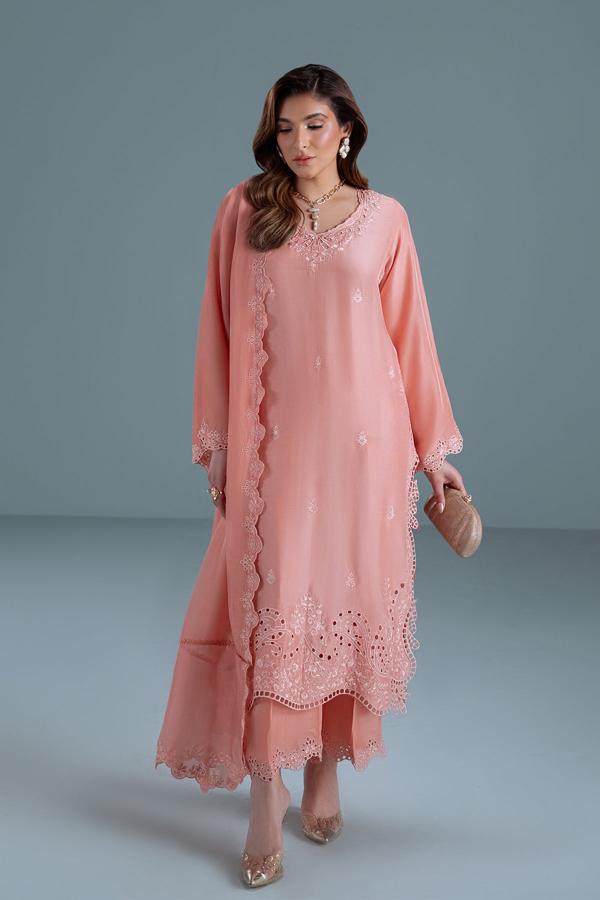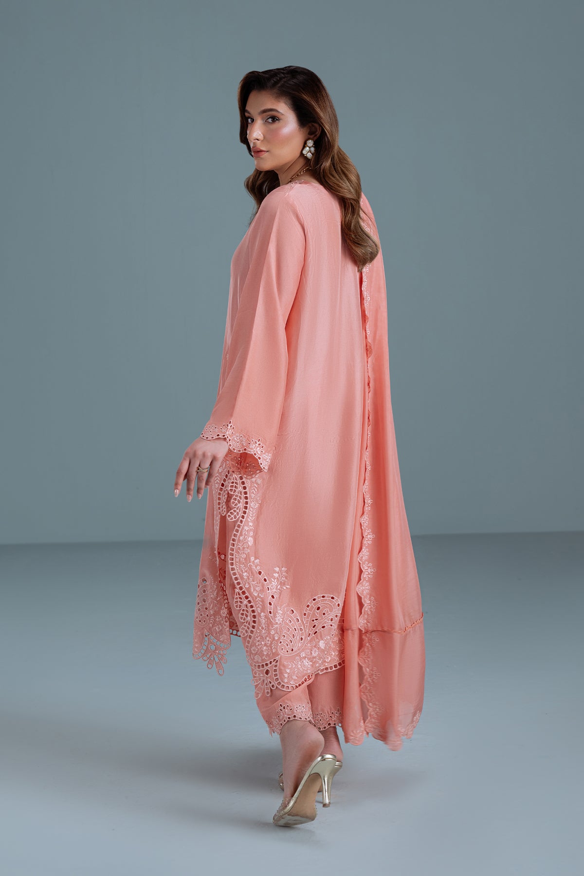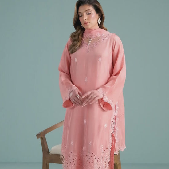 TANYA-B is a 3-piece dpeachy-pink sheesha silk outfit with colour-on-colour floral embroidery and intricate boring. Featuring 3D boring along the hem and sides & paired with matching loose embroidered trousers. Completed with a medium silk dupatta, scalloped and framed with floral embroidery on all four sides.