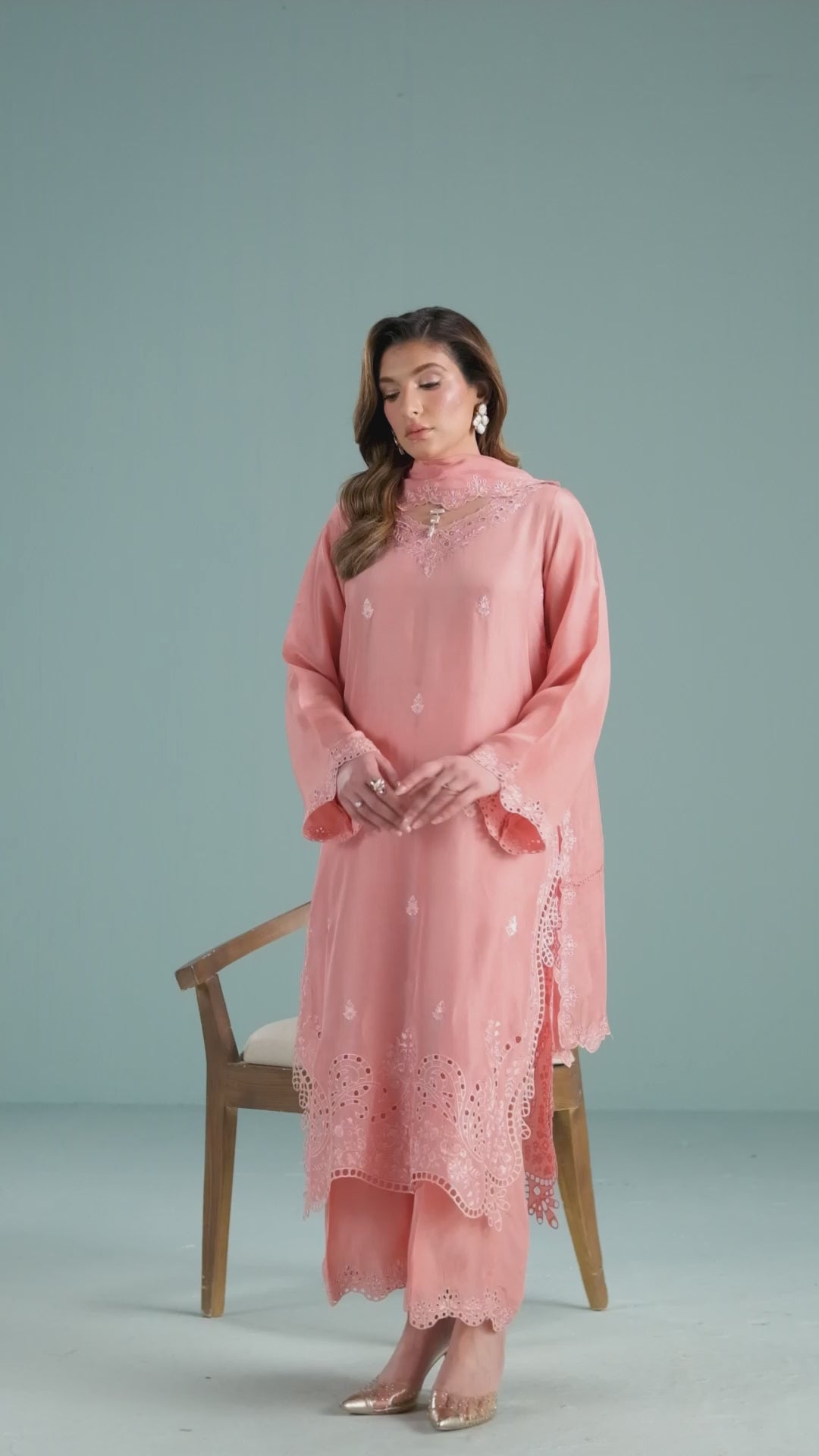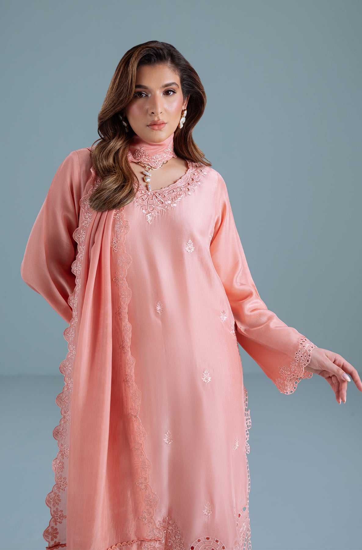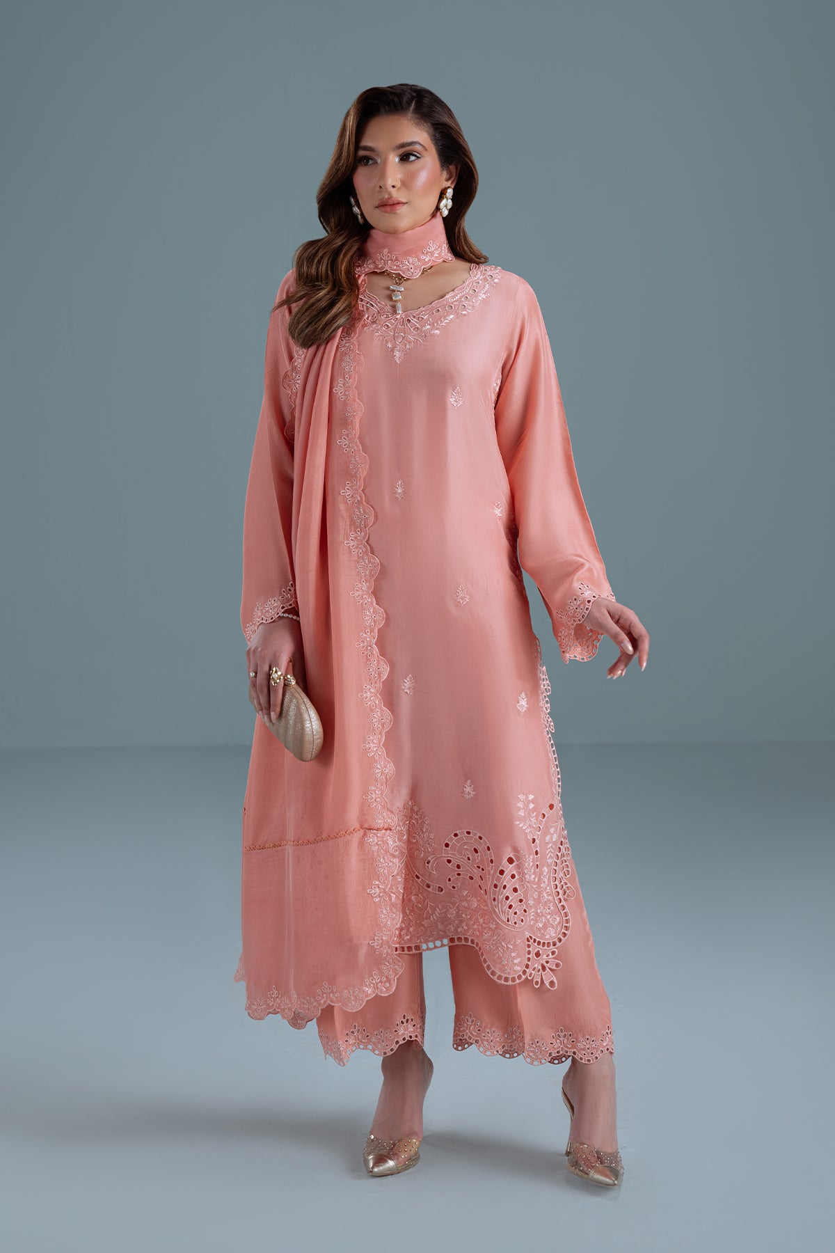 TANYA-B is a 3-piece dpeachy-pink sheesha silk outfit with colour-on-colour floral embroidery and intricate boring. Featuring 3D boring along the hem and sides & paired with matching loose embroidered trousers. Completed with a medium silk dupatta, scalloped and framed with floral embroidery on all four sides.